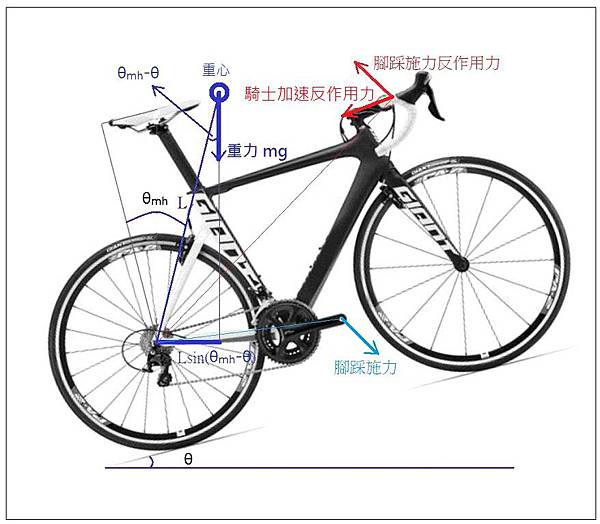 ma : 驅動單車平移前進的淨分力. 單車質量m, 單車加速度a.