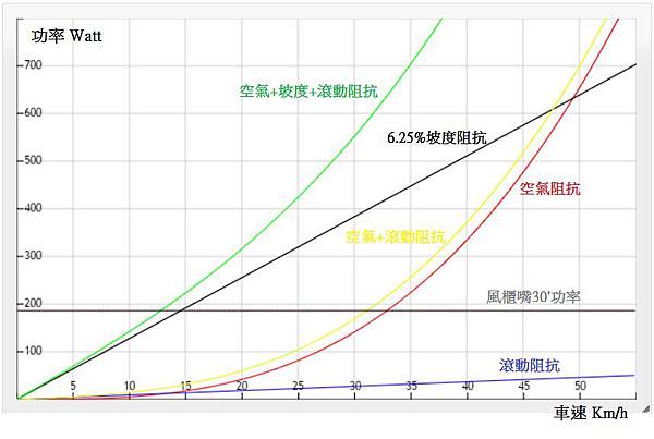 意思是說, 雖然阻力相同, 可是上風櫃嘴的速度不快, 功率會比平地騎49.3 Km/h低.